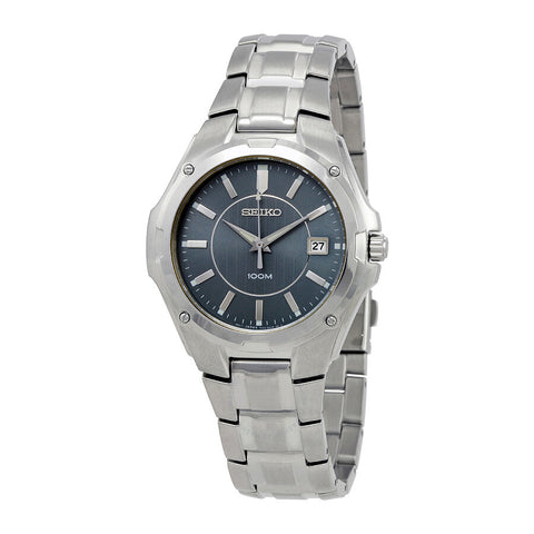 Description Stainless steel case with a stainless steel bracelet. Fixed stainless steel bezel. Blue dial with silver-tone hands and index hour markers. Minute markers around the outer rim. The Seiko...