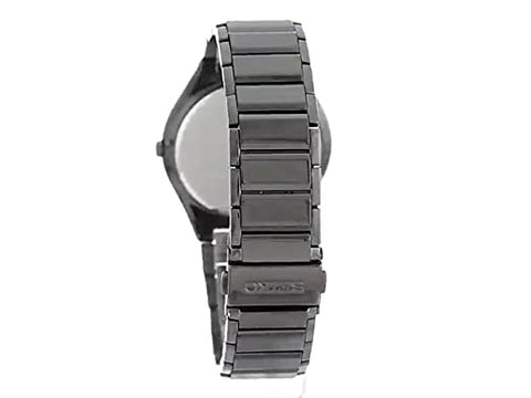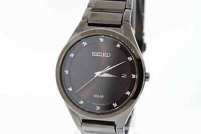 Description Black PVD stainless steel case and bracelet. Fixed black PVD bezel. Black dial with silver-tone hands and diamond hour markers. Dial Type: Analog. Date display at the 3 o'clock...